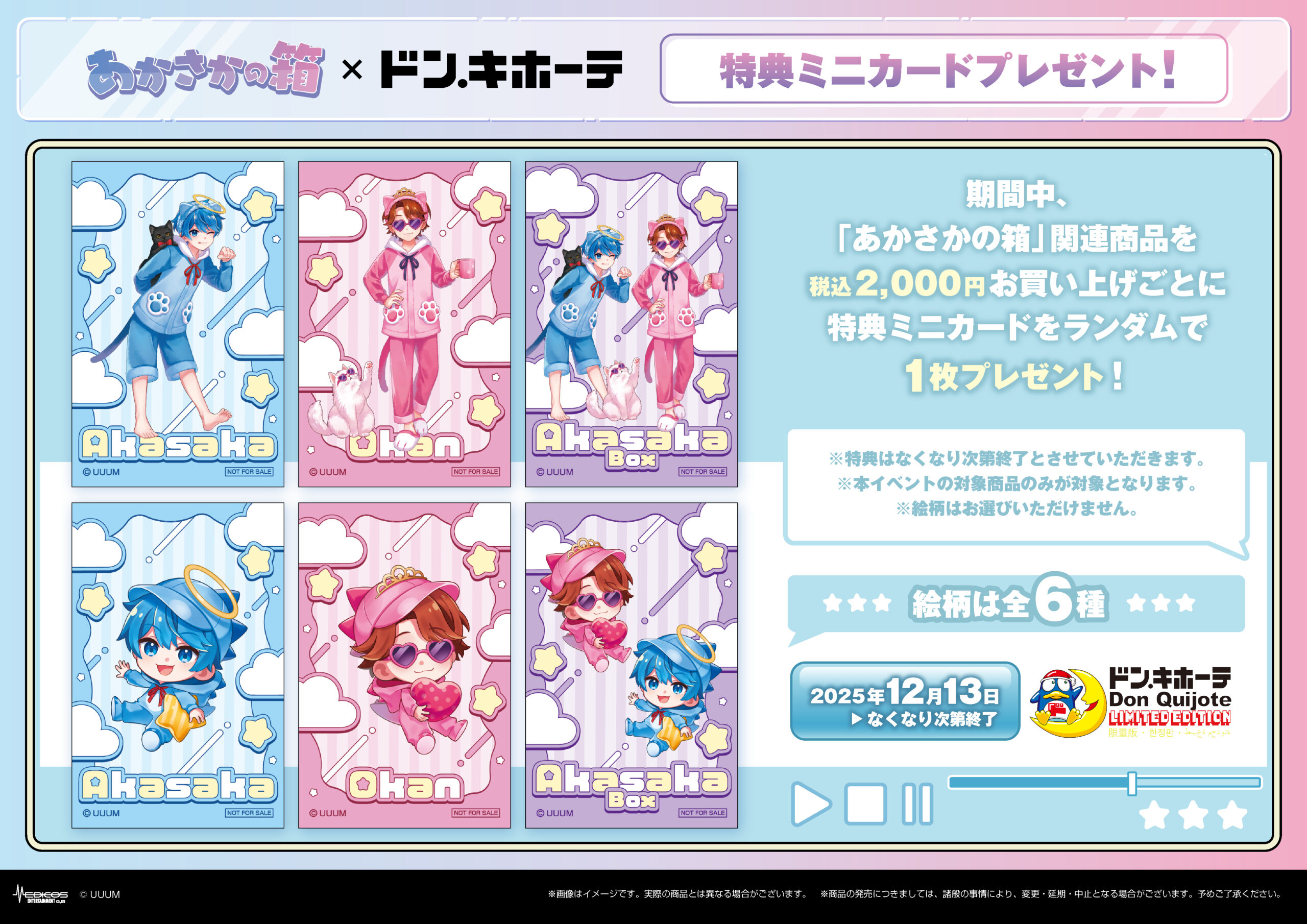 期間中、ドン・キホーテ対象店舗にて「あかさかの箱」関連商品を一会計につき税込2,000円お買い上げごとに特典ミニカード(全6種)をランダムで1枚プレゼント!