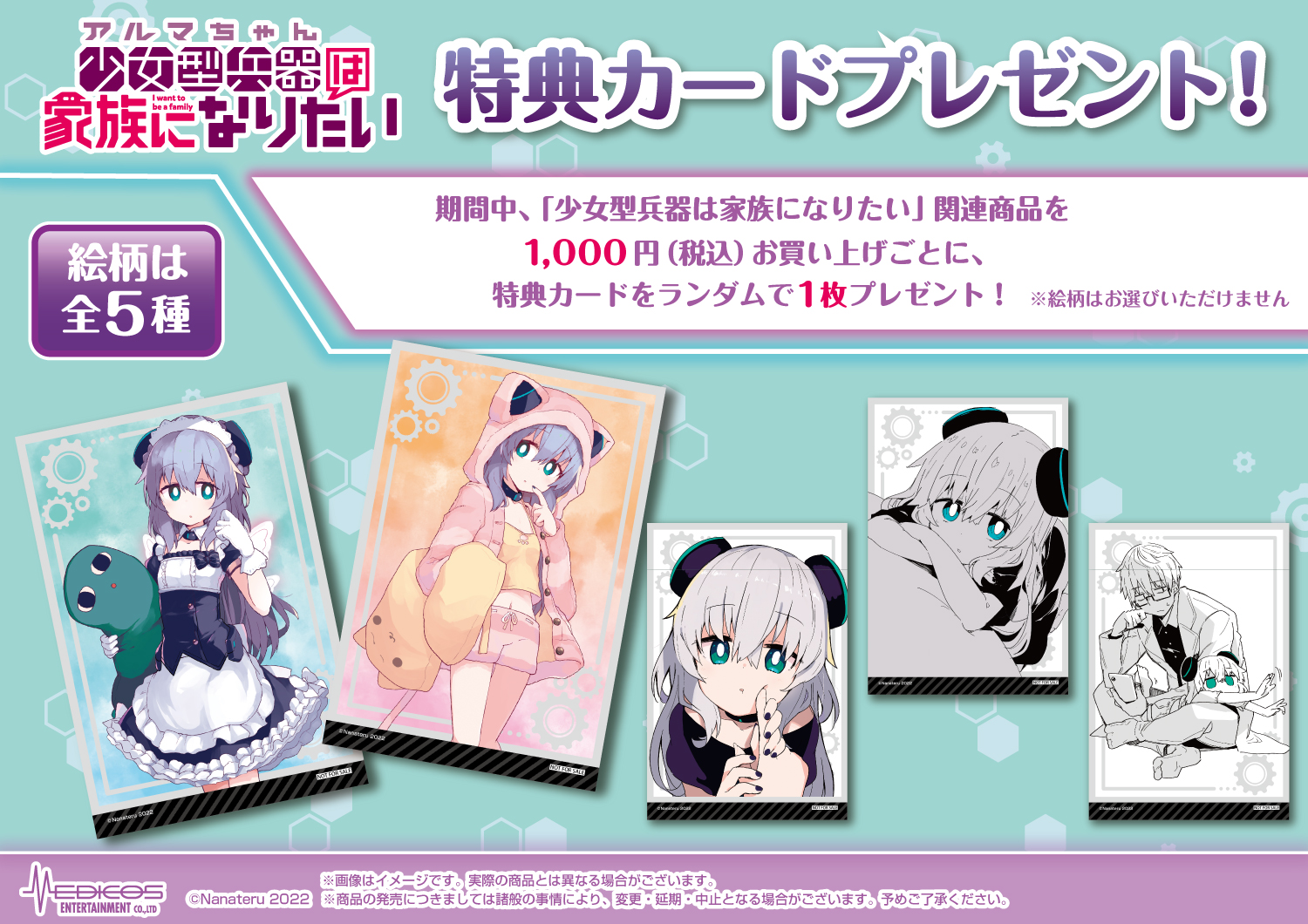 期間中、「少女型兵器は家族になりたい」関連商品を1,000円(税込)お買い上げごとに特典カード(全5種)をランダムで1枚プレゼント!