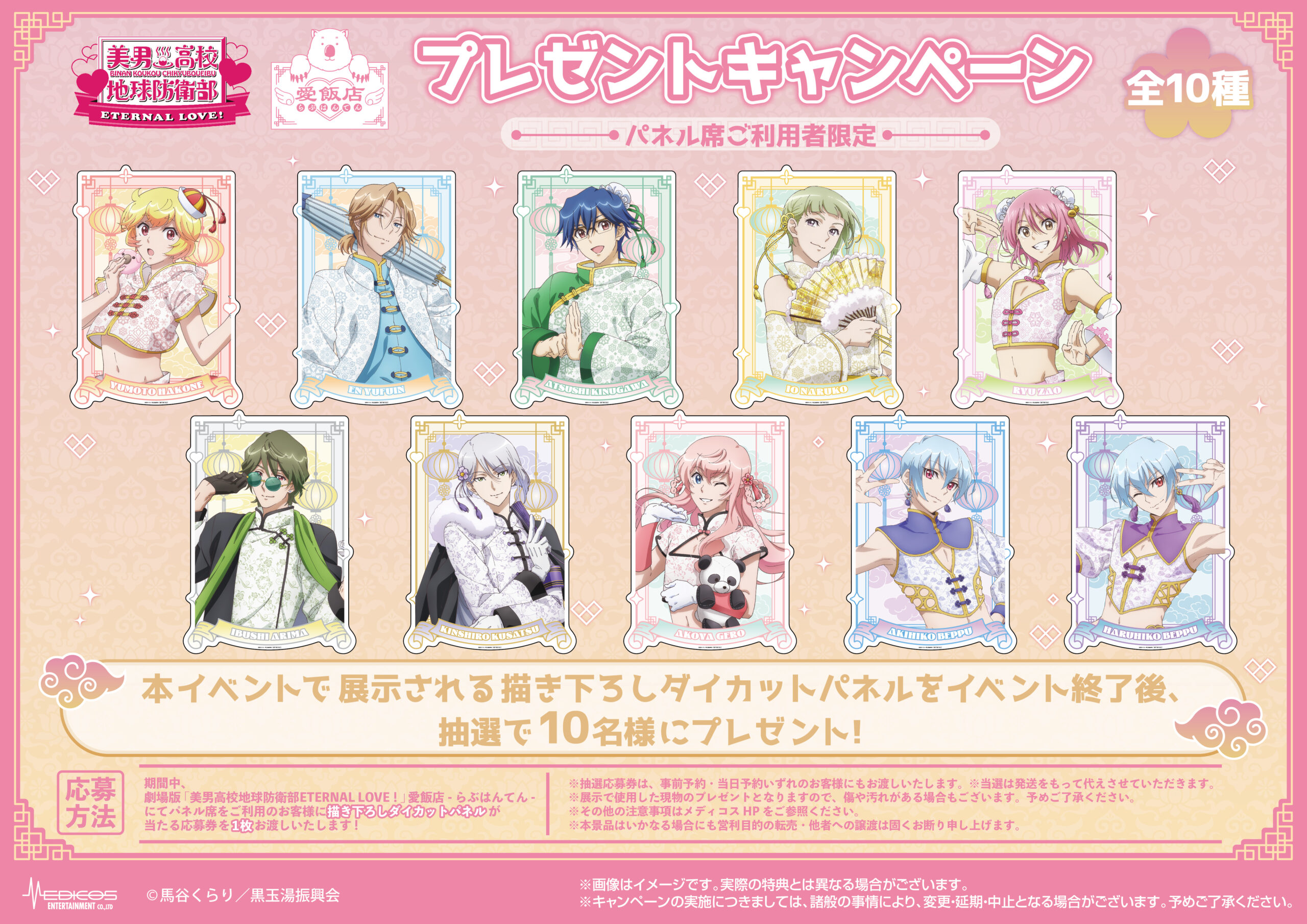 期間中、劇場版「美男高校地球防衛部ETERNAL LOVE!」愛飯店–らぶはんてん–にてキャラクターパネル席をご利用のお客様に、お一人様1回のご利用につき応募券を1枚お渡しいたします。