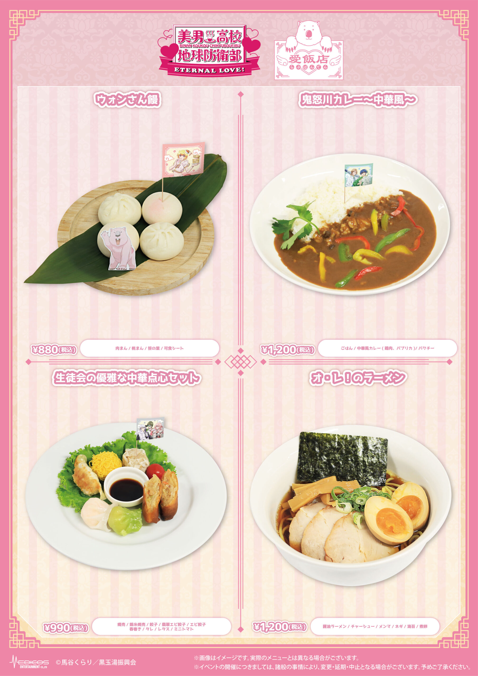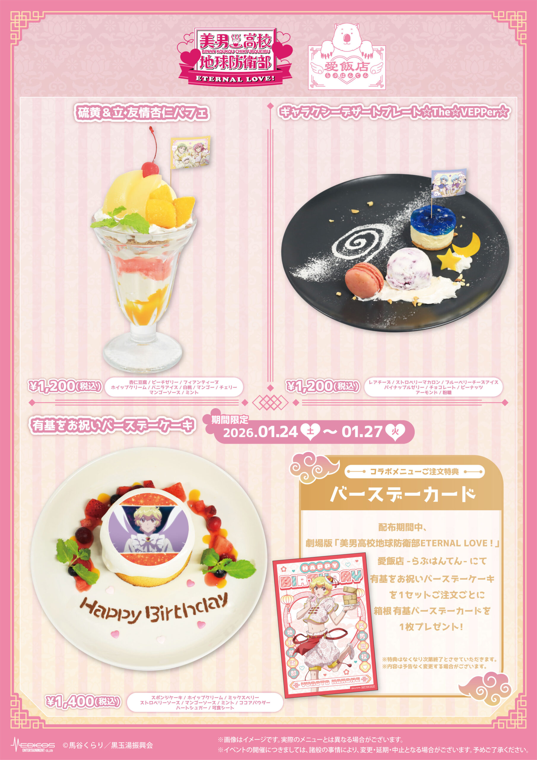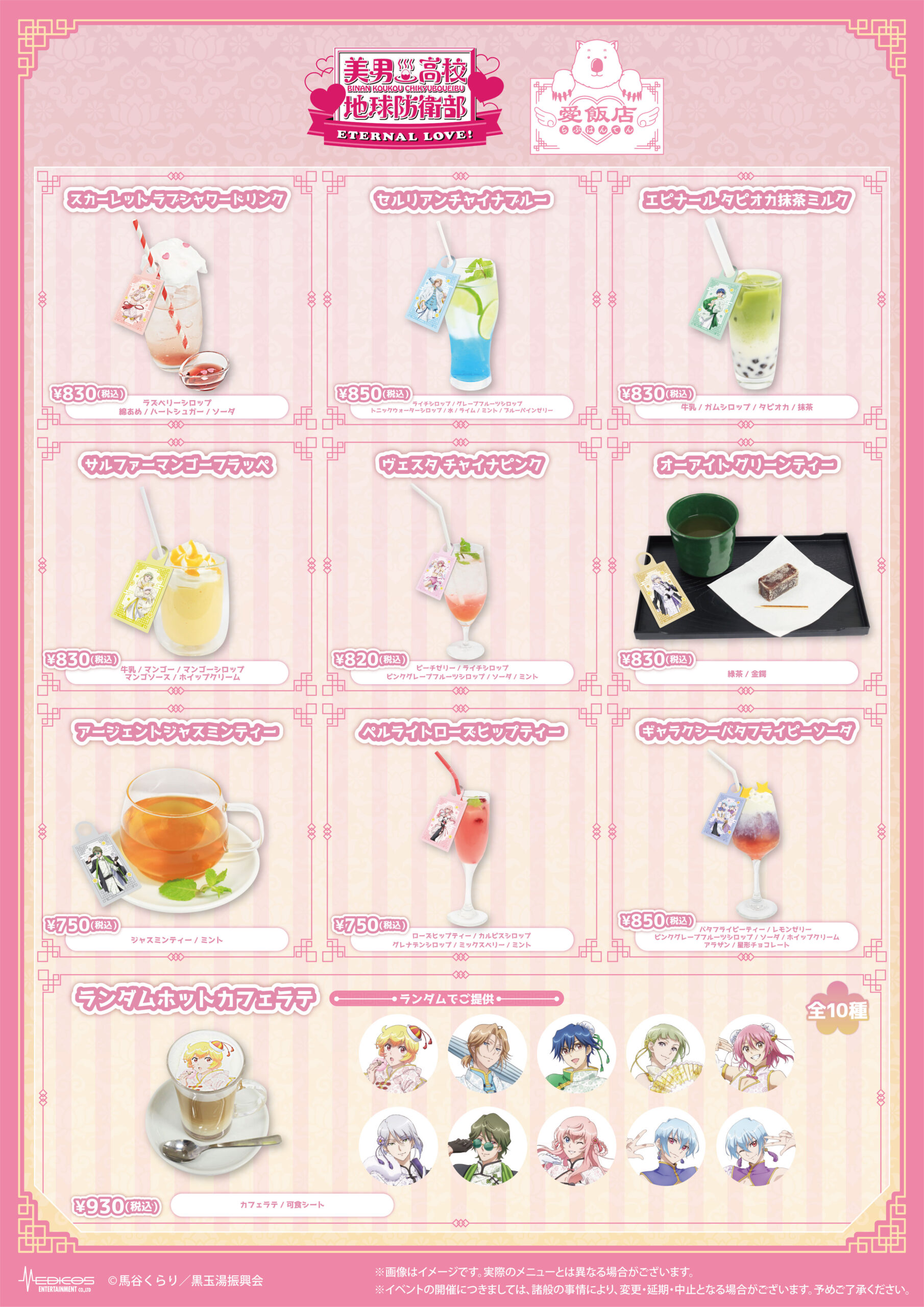 期間中、劇場版「美男高校地球防衛部ETERNAL LOVE!」愛飯店–らぶはんてん–コラボメニューを1品ご注文ごとに特典コースター(全10種)をランダムで1枚プレゼント!