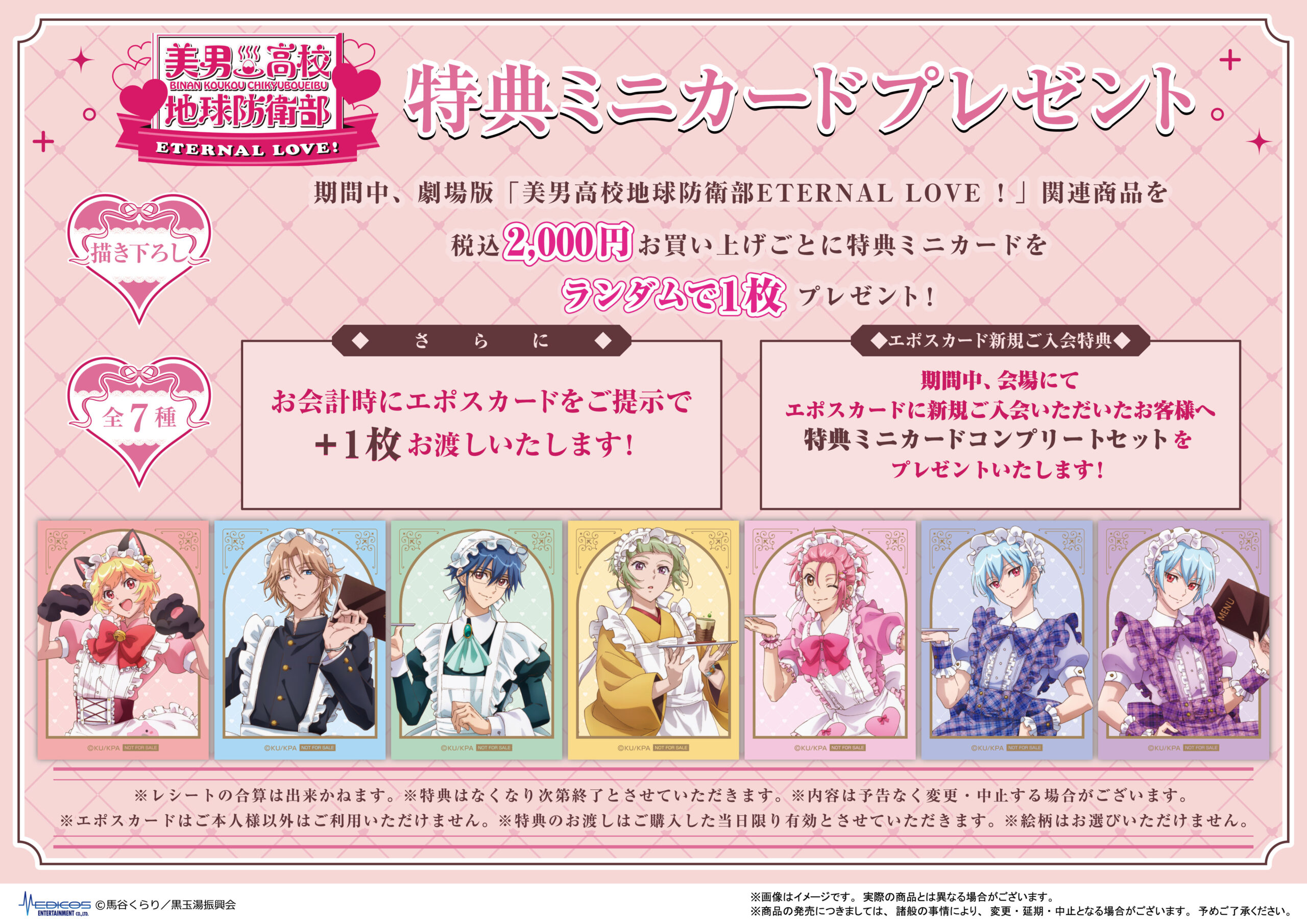 期間中、劇場版「美男高校地球防衛部ETERNAL LOVE!」関連商品を2,000円(税込)お買い上げごとに特典ミニカード(全7種)をランダムで1枚プレゼント!