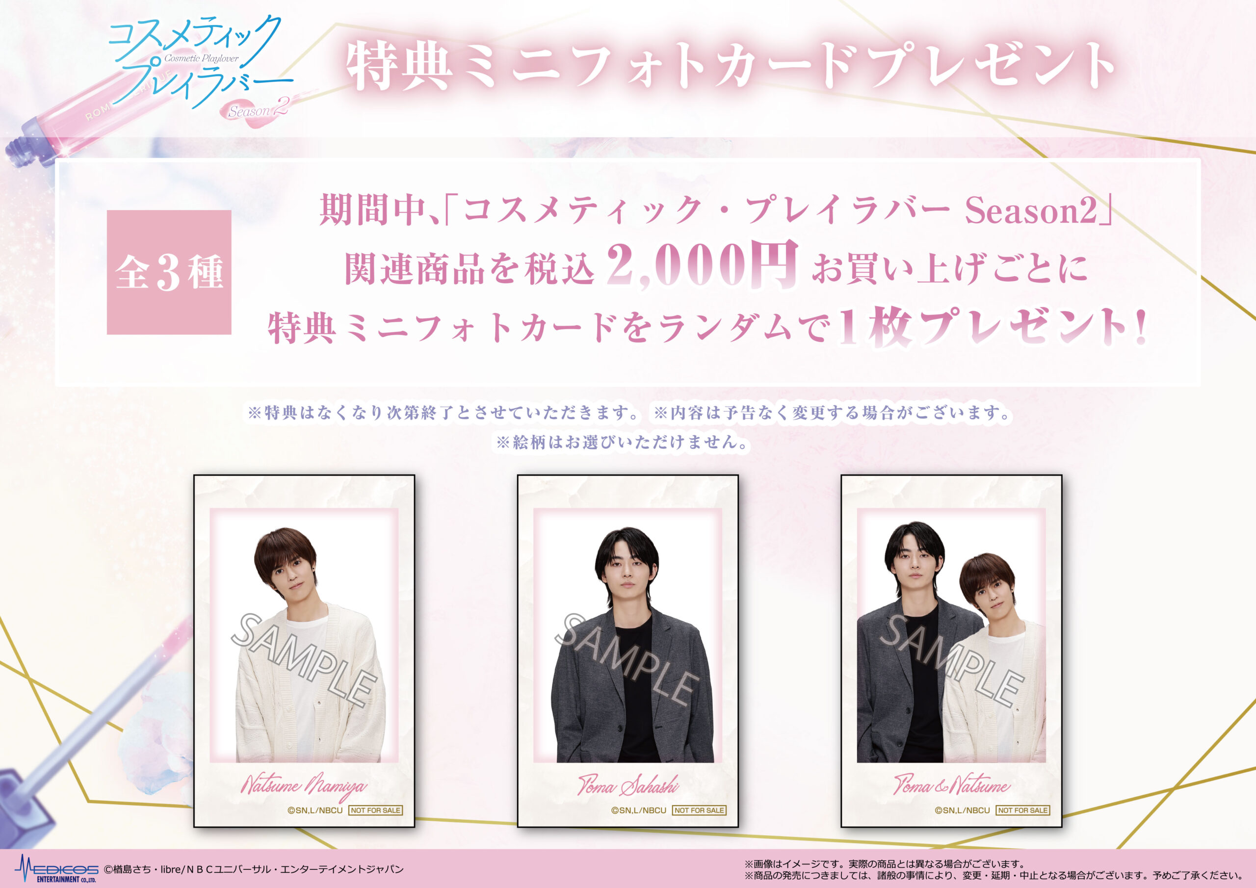 期間中、「コスメティック・プレイラバー Season2」関連商品を2,000円(税込)お買い上げごとに特典ミニフォトカード(全3種)をランダムで1枚プレゼント!