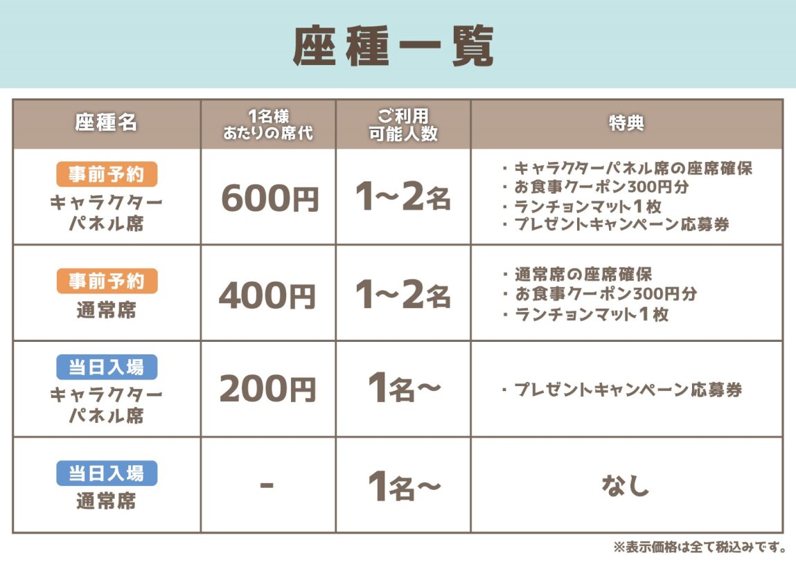 なお、当日入場にてキャラクターパネル席をご利用の場合には、キャラクターパネル席代としてご利用1名様につき税込200円を頂戴いたします(通常席をご利用の場合には席代は発生いたしません)。