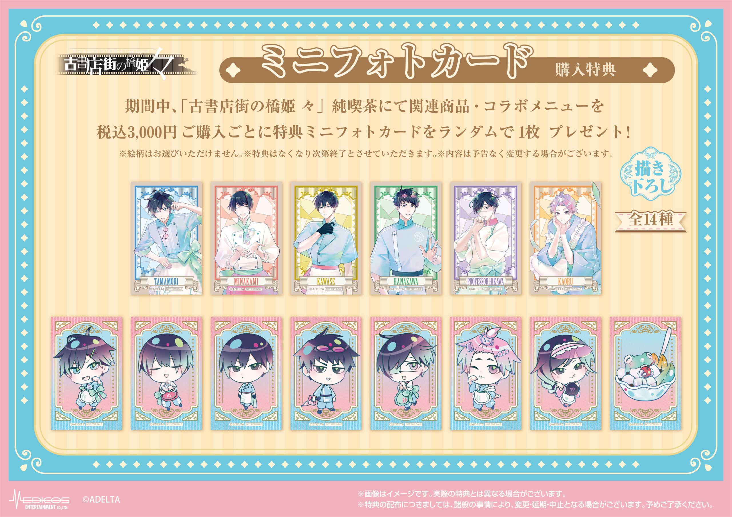 期間中、「古書店街の橋姫 々」関連商品(コラボメニューを含む)を税込3,000円お買い上げごとに特典ミニフォトカード(全14種)をランダムで1枚プレゼント!