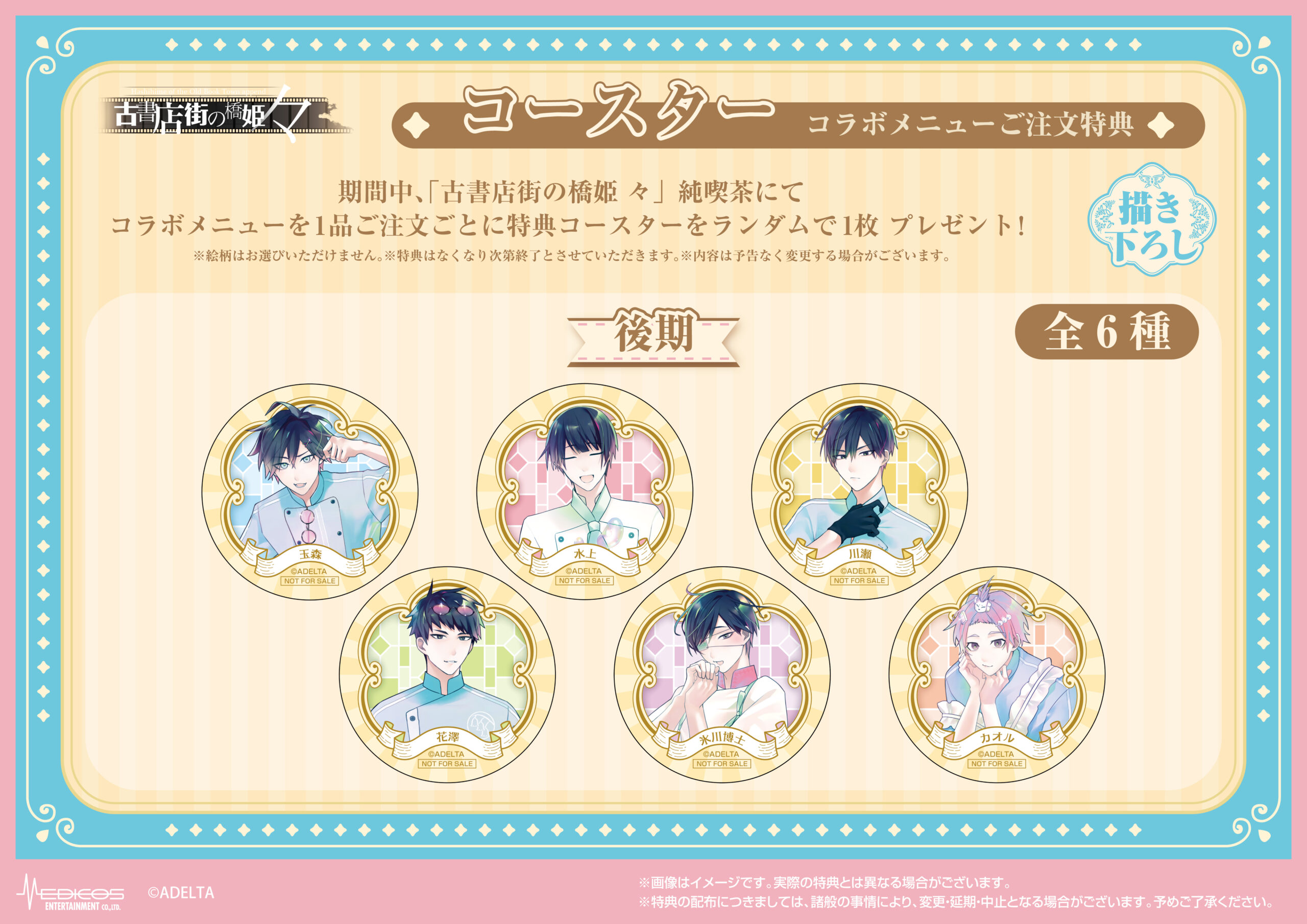 期間中、「古書店街の橋姫 々」コラボメニューを1品ご注文ごとに特典コースターをランダムで1枚プレゼント!