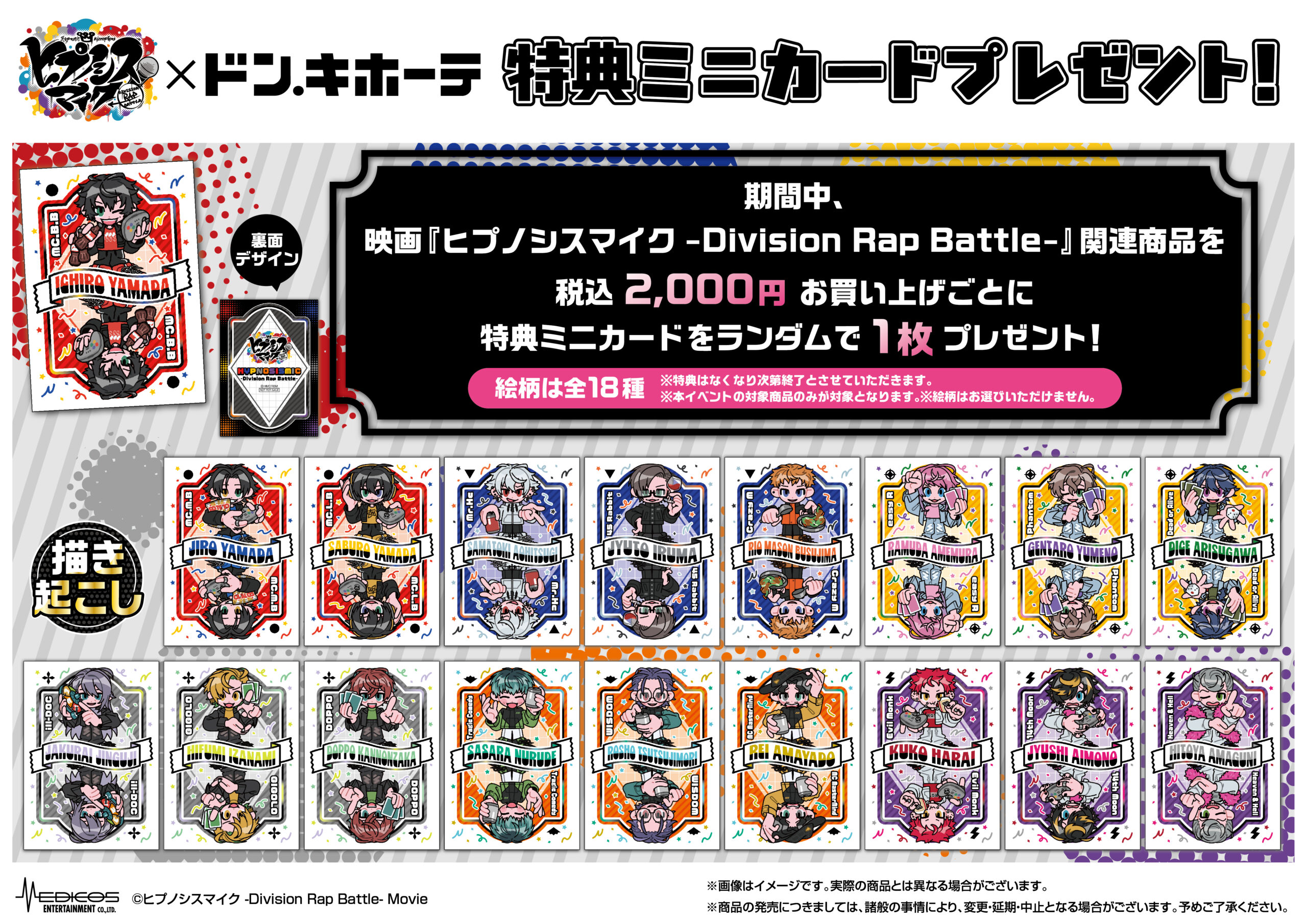 期間中、ドン・キホーテ対象店舗にて映画『ヒプノシスマイク -Division Rap Battle-』関連商品を一会計につき税込2,000円お買い上げごとに特典ミニカード(全18種)をランダムで1枚プレゼント!