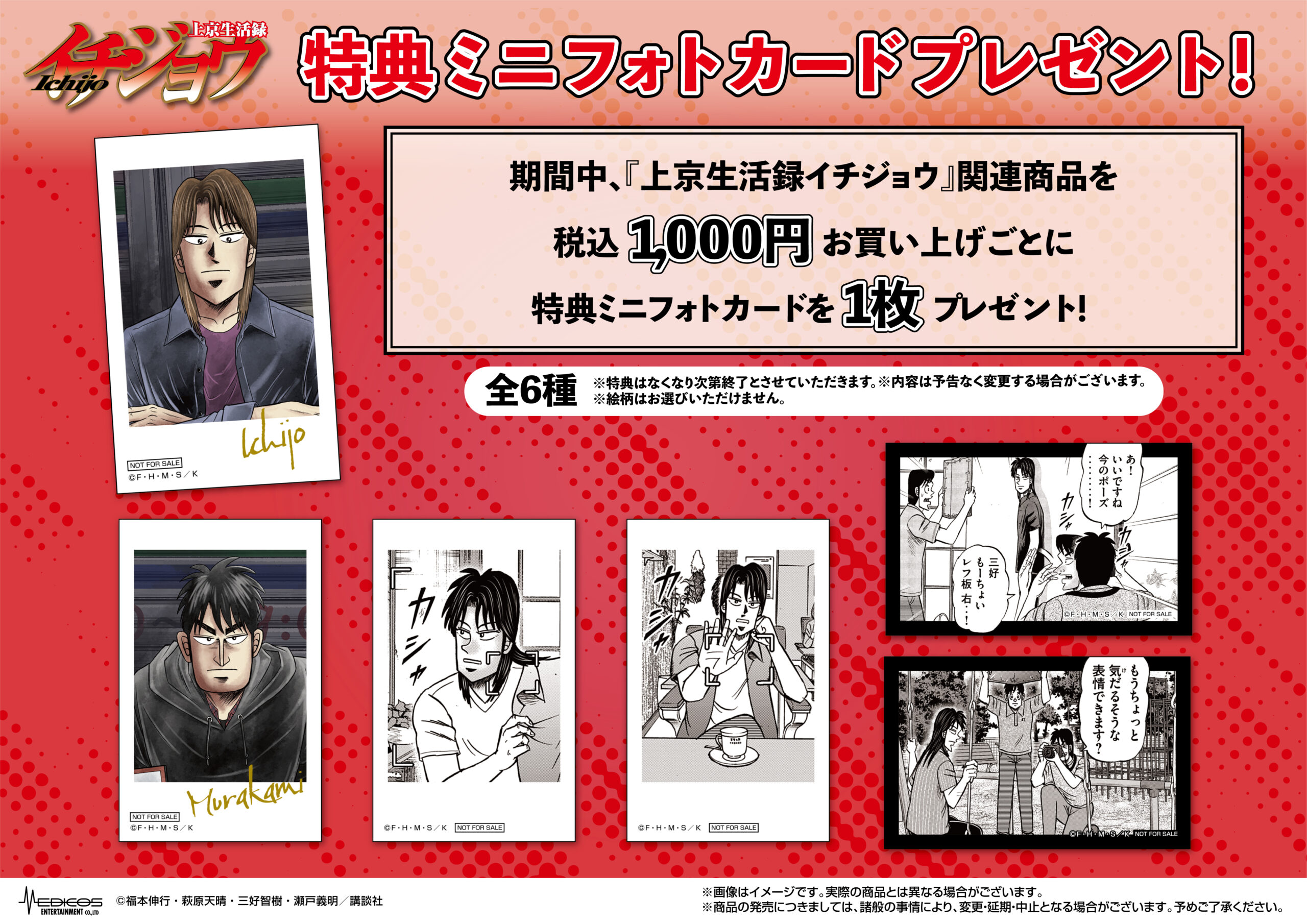 期間中、『上京生活録イチジョウ』関連商品を1,000円(税込)お買い上げごとに特典ミニフォトカード(全6種)をランダムで1枚プレゼント!