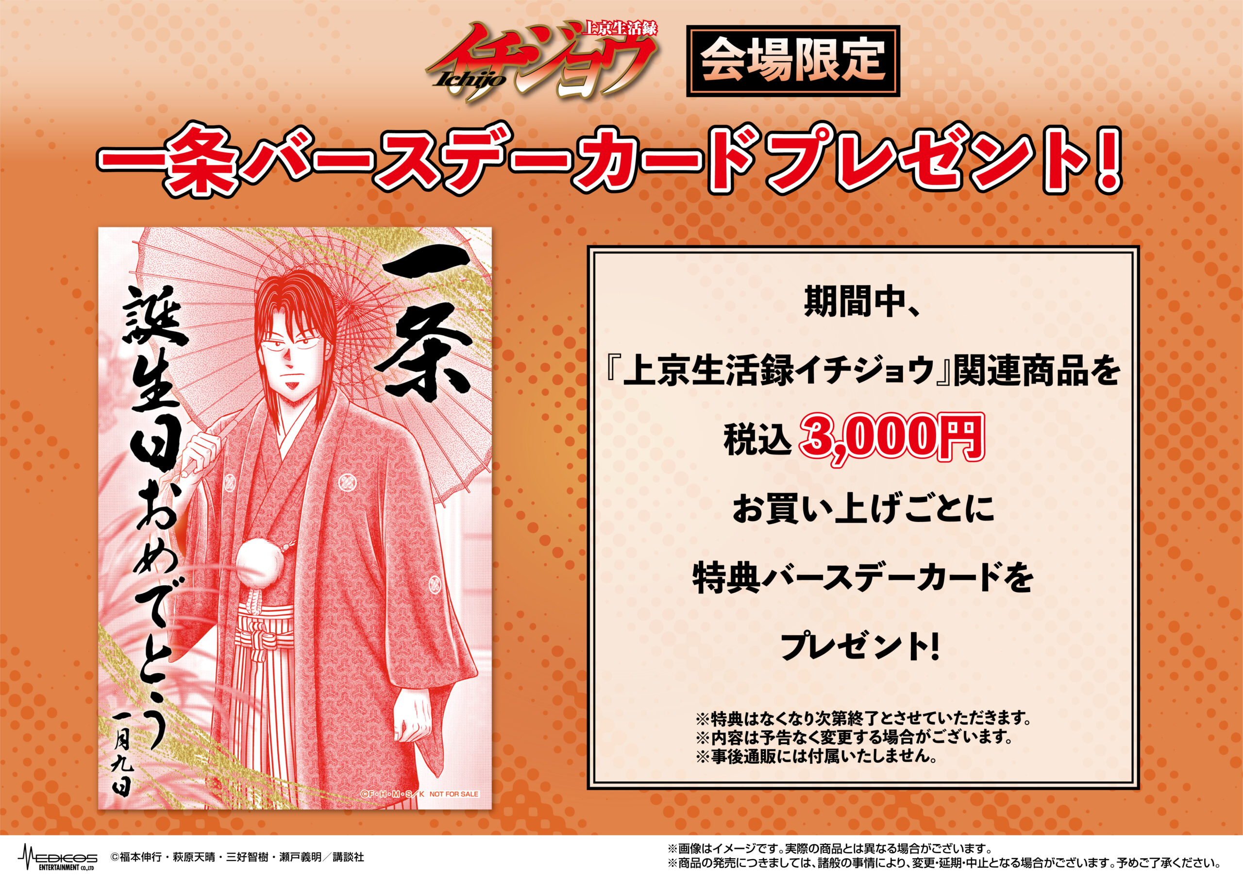 期間中、『上京生活録イチジョウ』関連商品を3,000円(税込)お買い上げごとに会場限定特典一条バースデーカード(全1種)を1枚プレゼント!