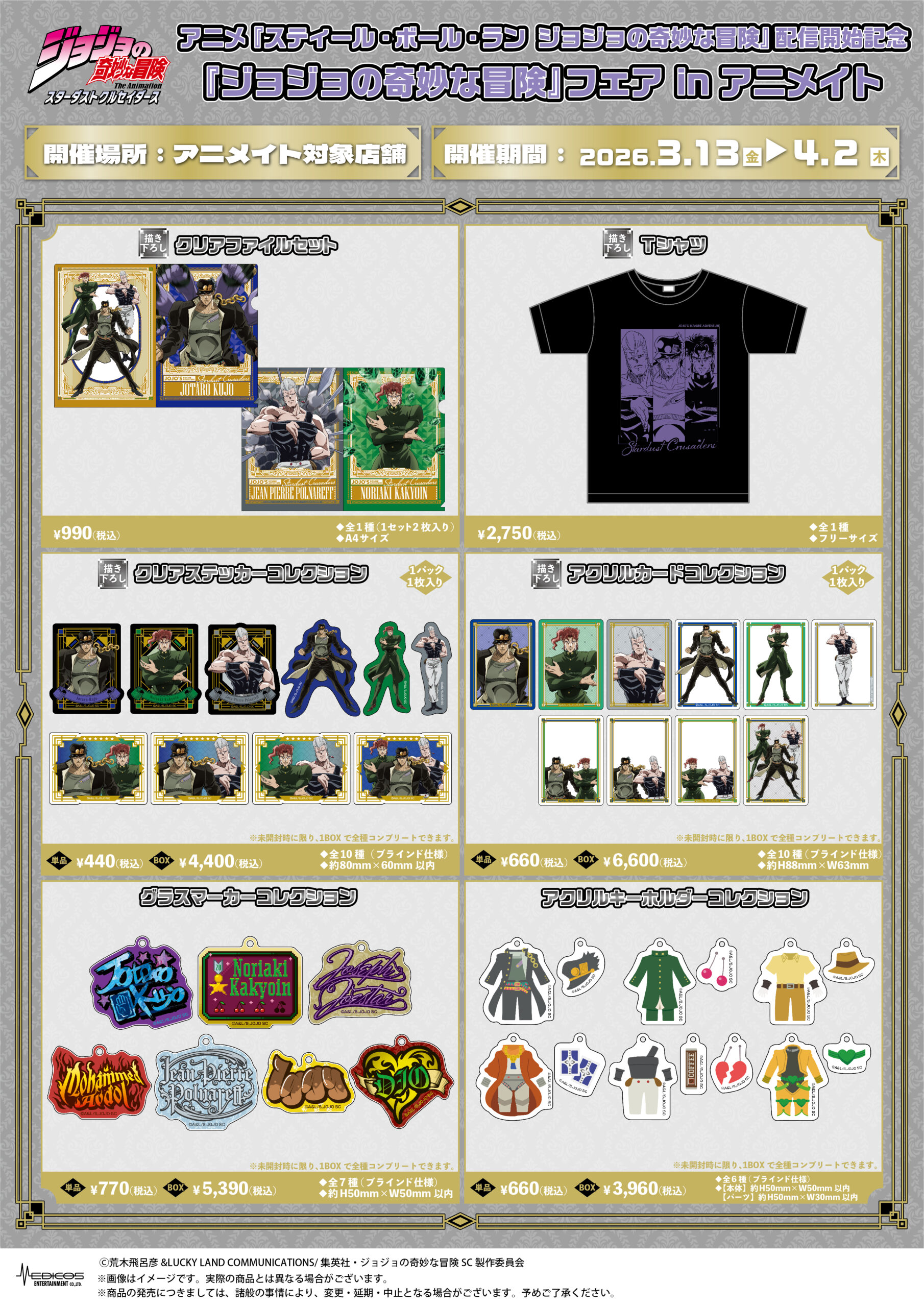 情報の追加・更新は、当ページおよびX「メディコス・エンタテインメント_ジョジョ」にてご案内いたしますので、ご来場の際はご確認の程お願い申し上げます。