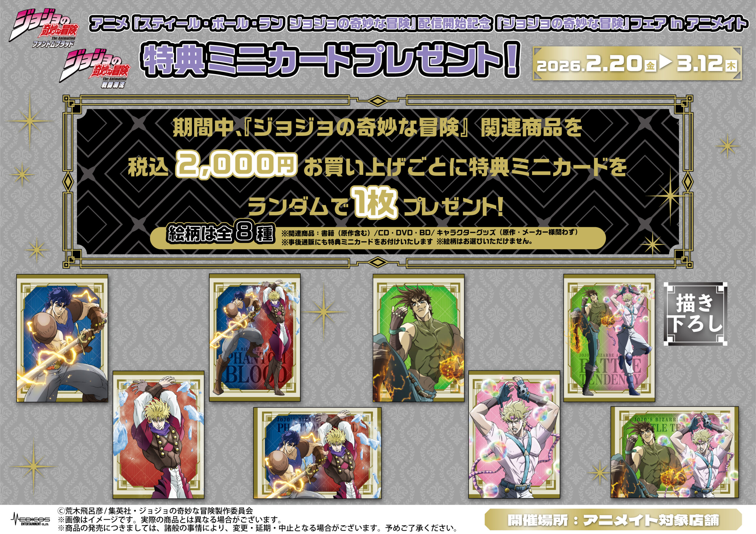 また、期間中『ジョジョの奇妙な冒険』関連商品を2,000円(税込)お買い上げごとに特典ミニカードを1枚プレゼント!