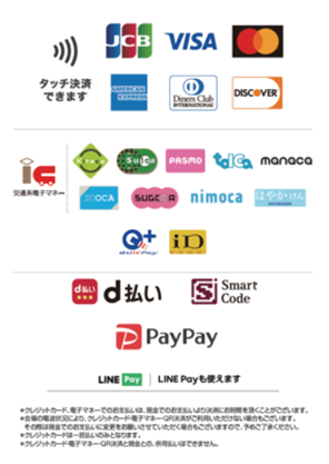 現金でのお支払いの他、ご利用可能な決済方法は下記の通りです。