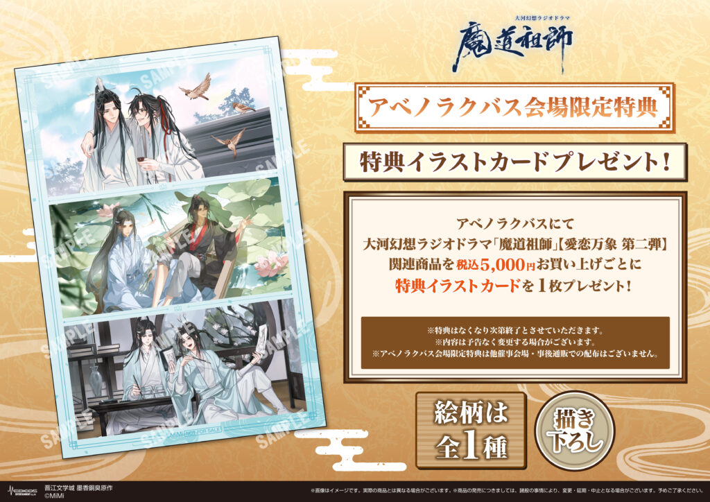 アベノラクバスにて大河幻想ラジオドラマ「魔道祖師」【愛恋万象 第二弾】関連商品を5,000円(税込)お買い上げごとにアベノラクバス会場限定特典イラストカード(全1種)を1枚プレゼント!