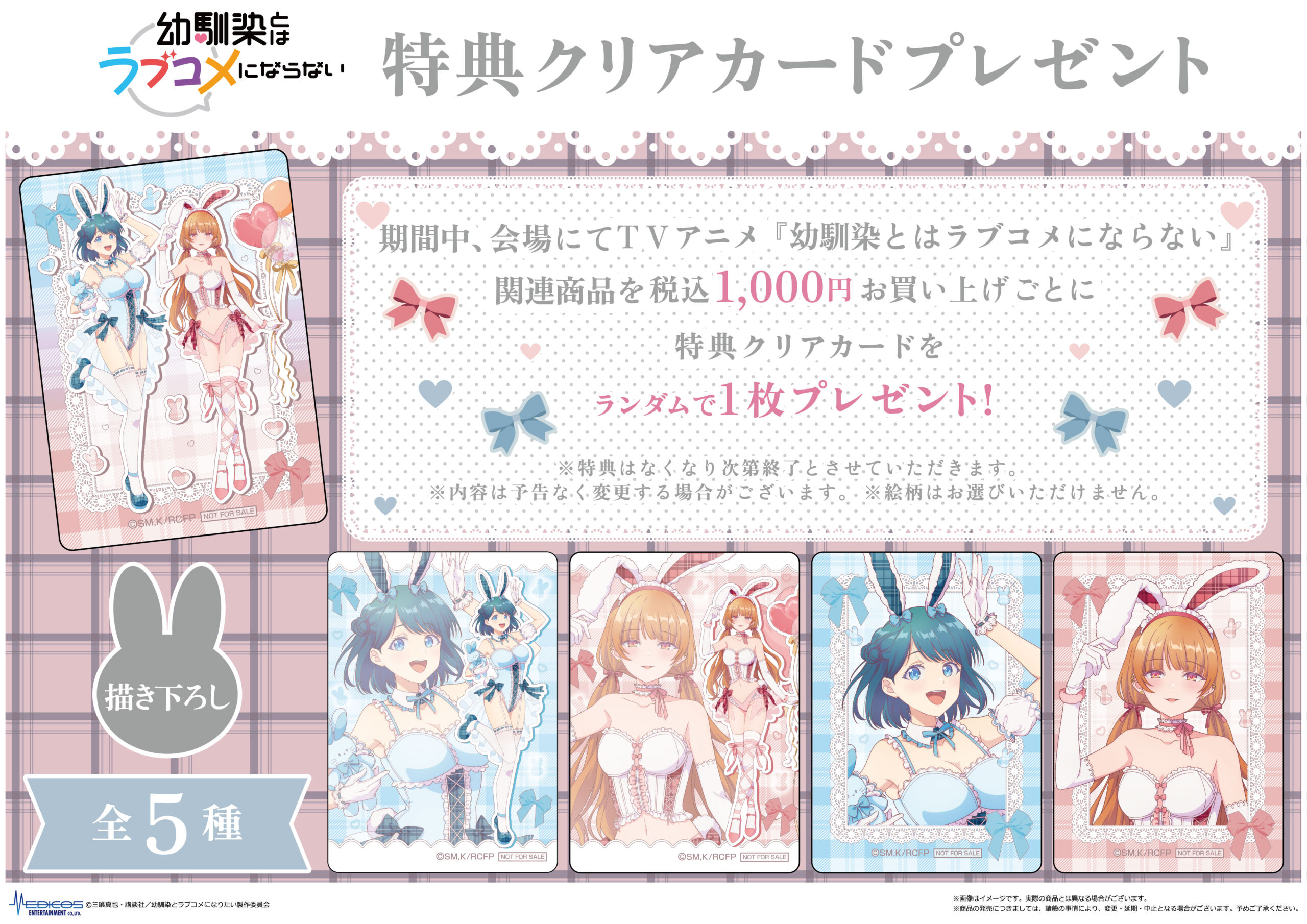 期間中、TVアニメ『幼馴染とはラブコメにならない』関連商品を1,000円(税込)お買い上げごとに特典クリアカード(全5種)をランダムで1枚プレゼント!