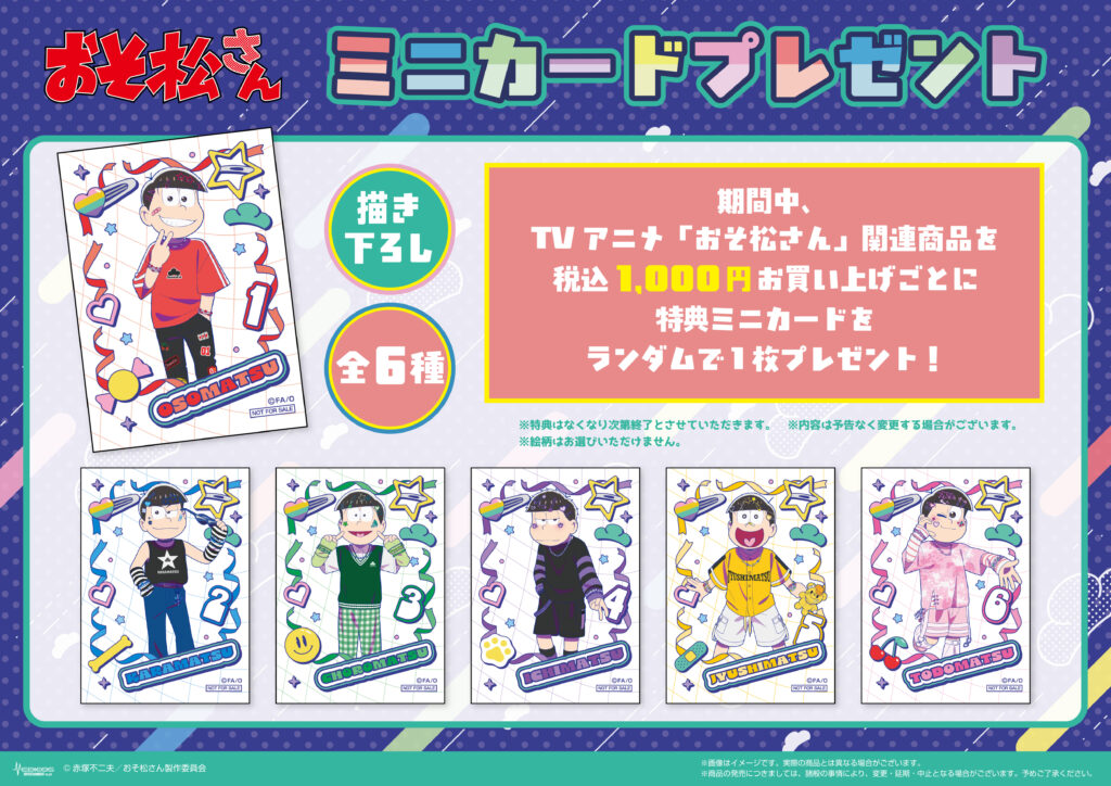 期間中、TVアニメ「おそ松さん」関連商品を1,000円(税込)お買い上げごとに特典ミニカード(全6種)をランダムで1枚プレゼント!
