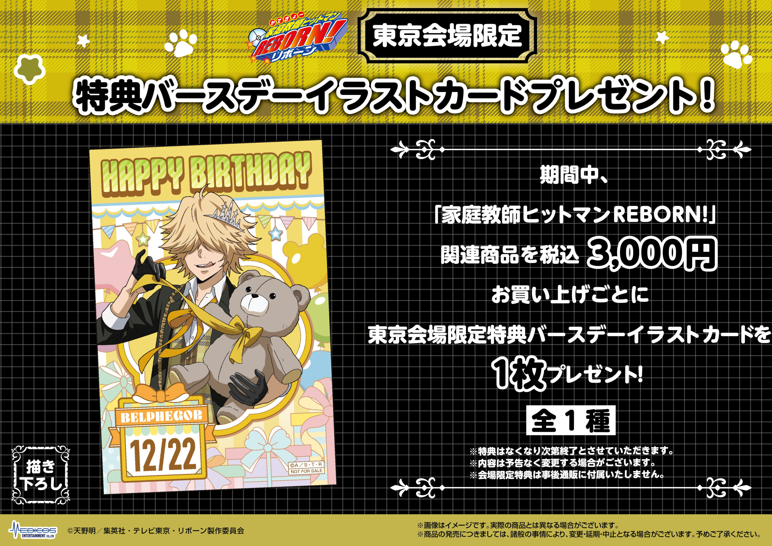東京会場の期間中、「家庭教師ヒットマンREBORN!」POP UP SHOP関連商品を3,000円(税込)お買い上げごとに東京会場限定特典バースデーイラストカード(全1種)を1枚プレゼント!