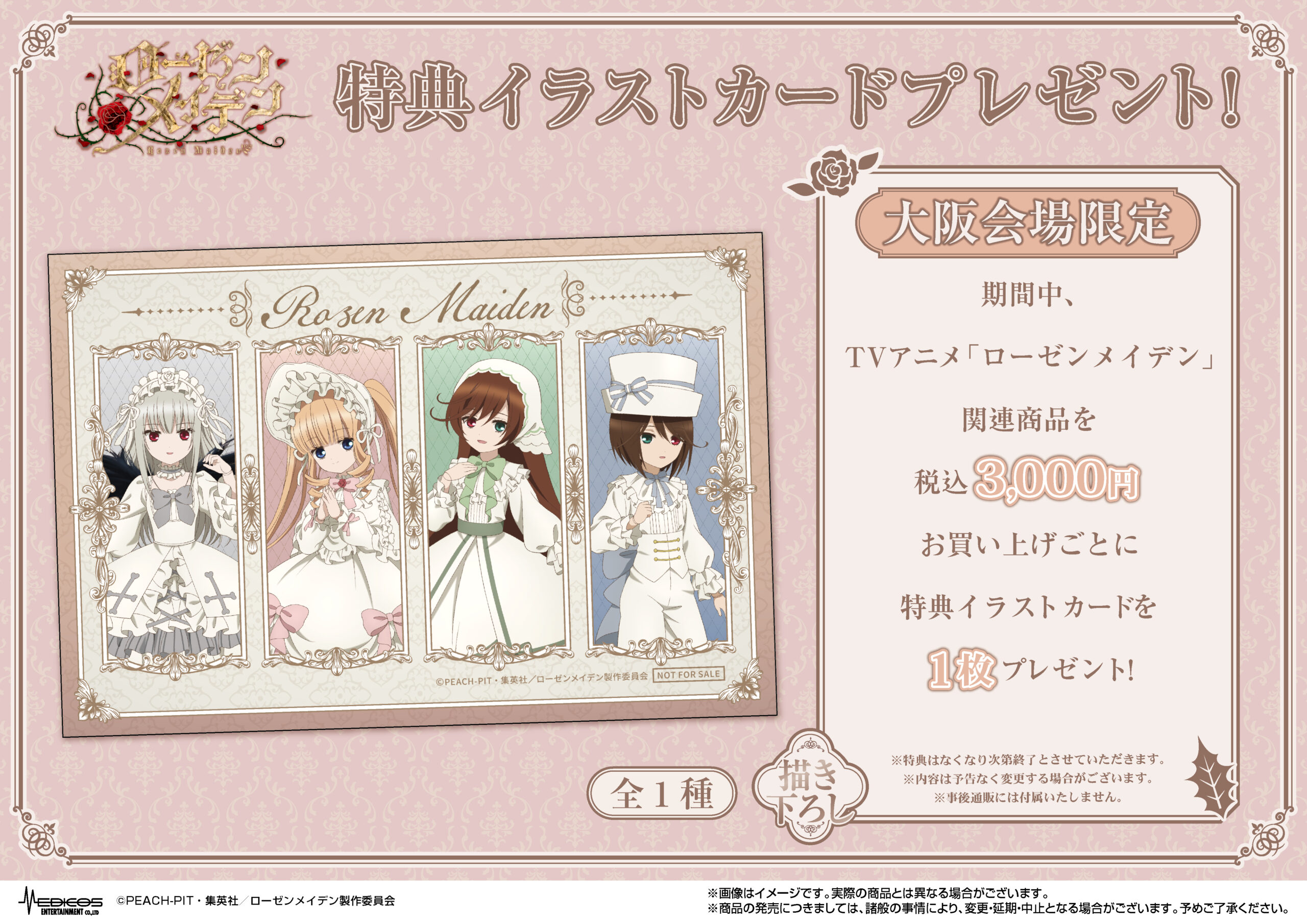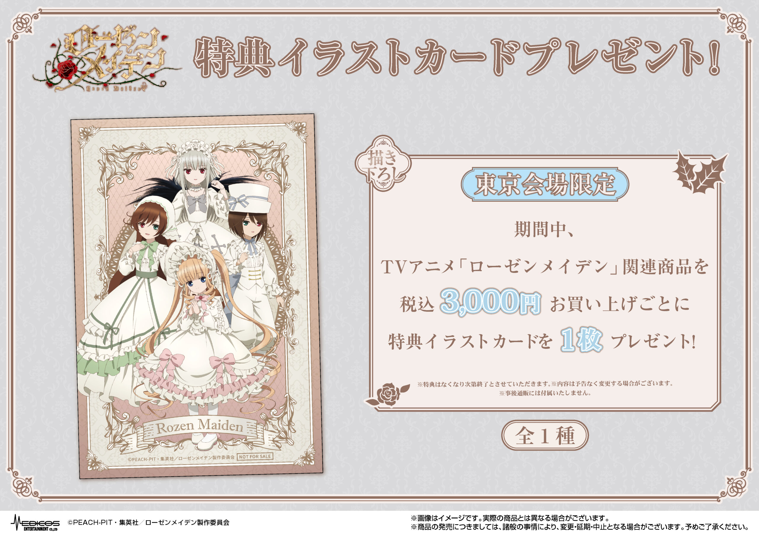 期間中、TVアニメ「ローゼンメイデン」POP UP SHOP関連商品を3,000円(税込)お買い上げごとに<各会場限定>特典イラストカードを1枚プレゼント!