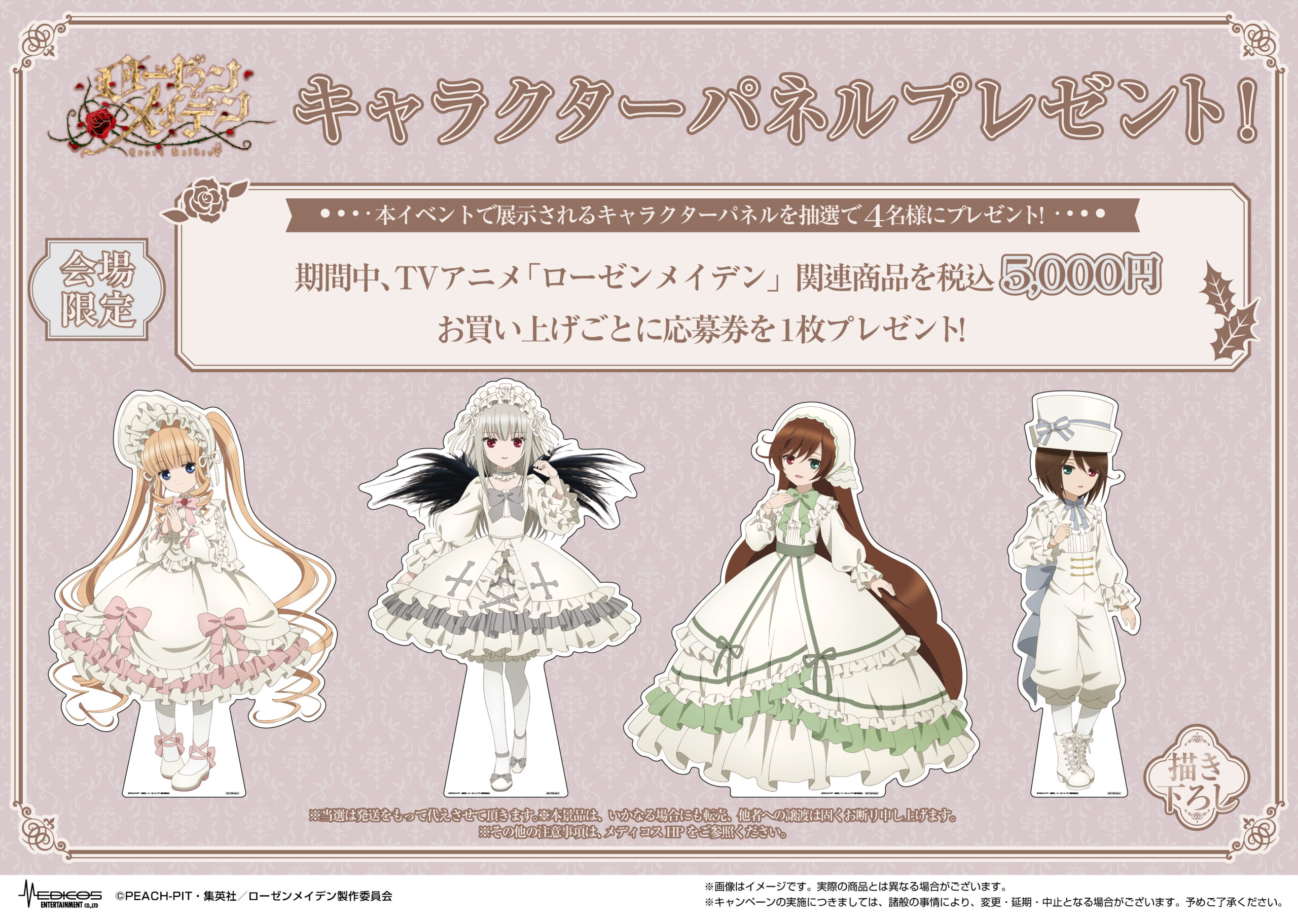 期間中、TVアニメ「ローゼンメイデン」関連商品を5,000円(税込)お買い上げごとに応募券を1枚お渡しいたします。