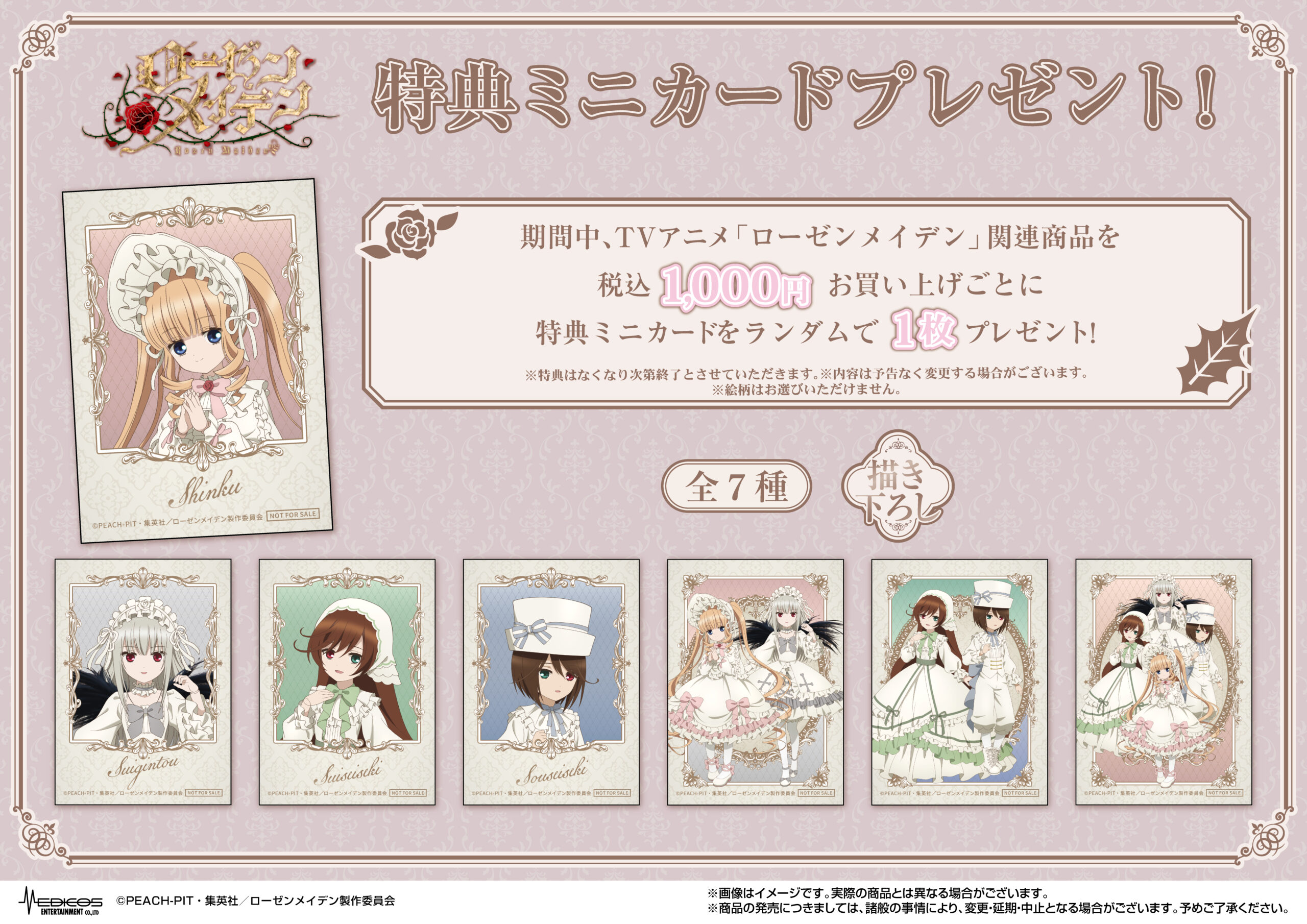 期間中、TVアニメ「ローゼンメイデン」POP UP SHOP関連商品を1,000円(税込)お買い上げごとに特典ミニカード(全7種)をランダムで1枚プレゼント!