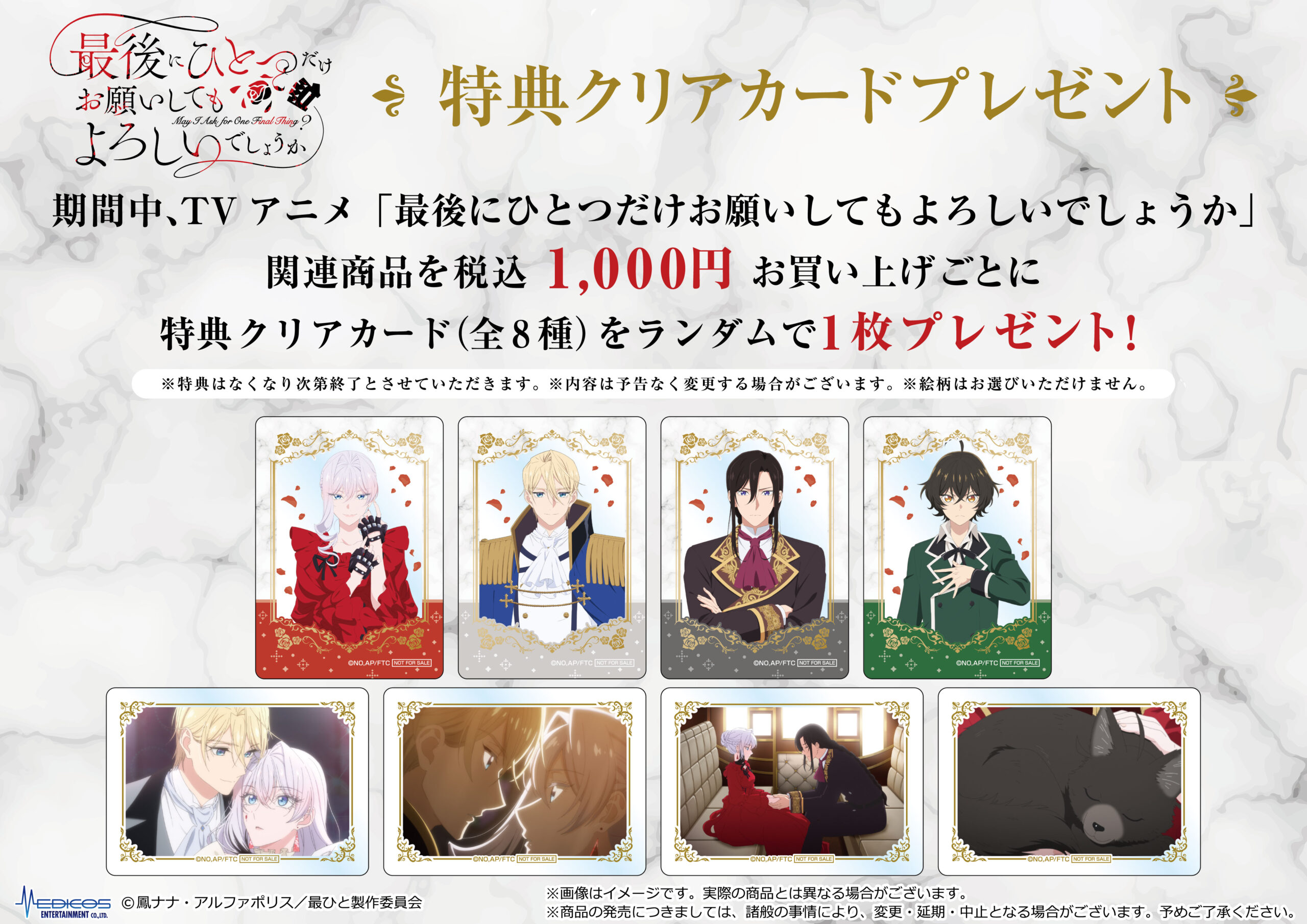 期間中、TVアニメ「最後にひとつだけお願いしてもよろしいでしょうか」関連商品を1,000円(税込)お買い上げごとに特典クリアカード(全8種)をランダムで1枚プレゼント!