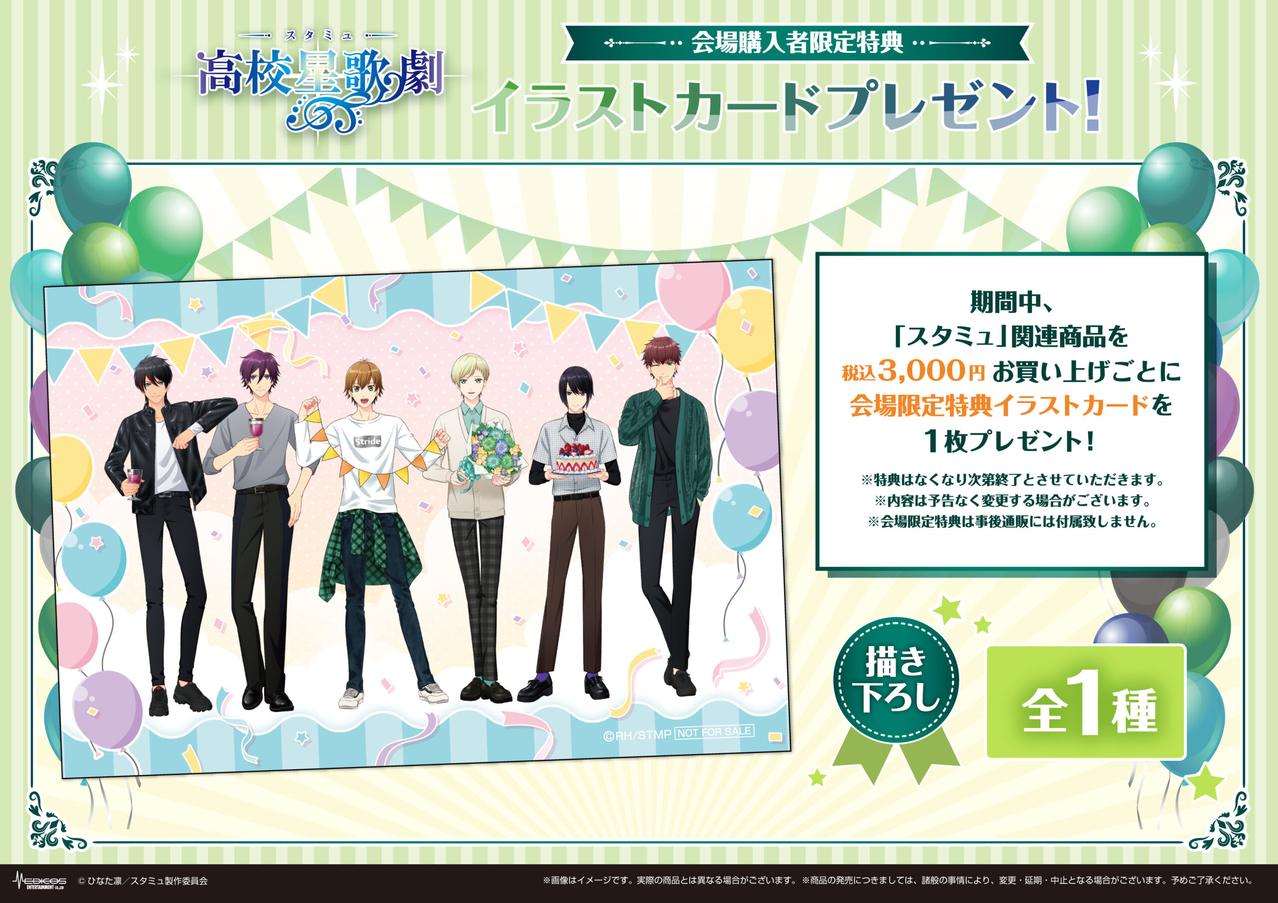 期間中、「スタミュ」関連商品を3,000円(税込)お買い上げごとに特典イラストカード(全1種)を1枚プレゼント!