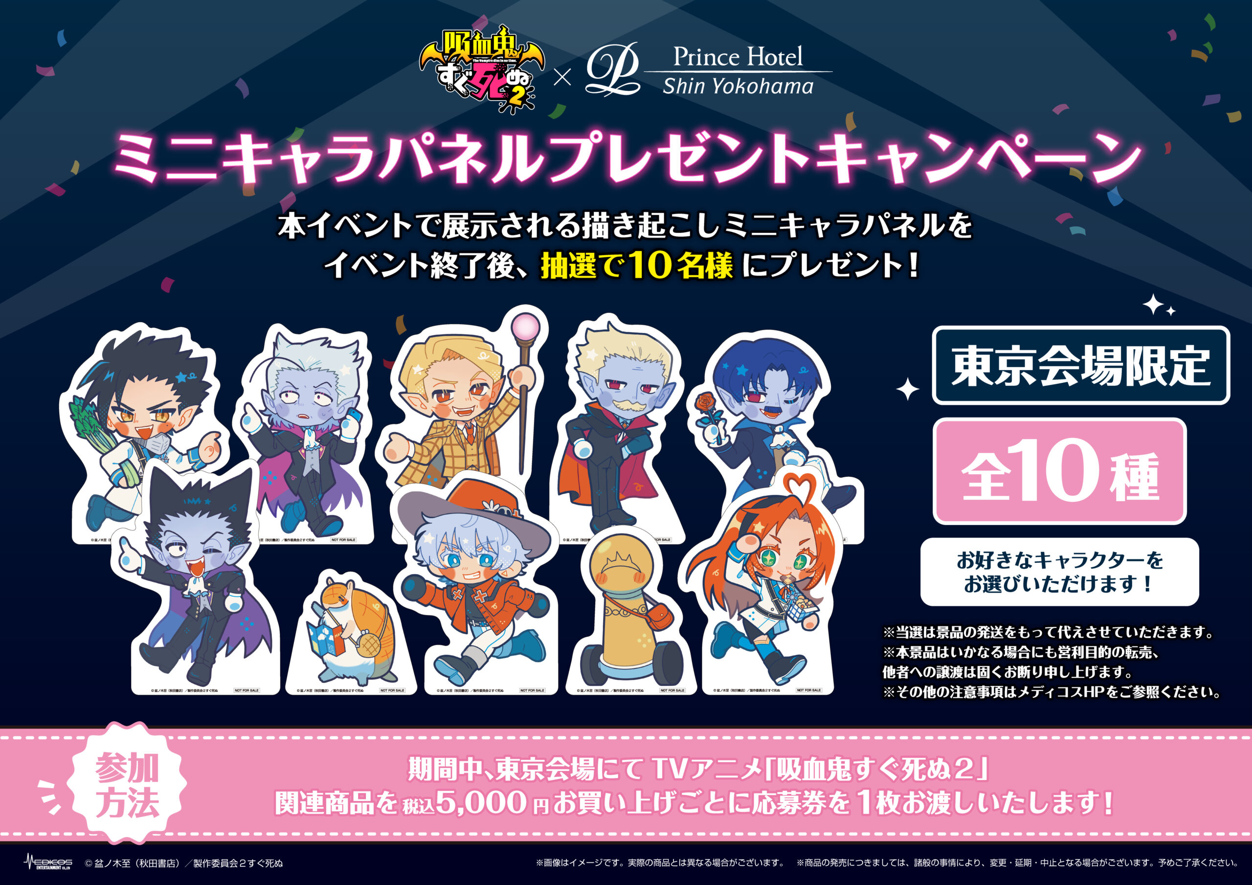期間中、東京会場にてTVアニメ「吸血鬼すぐ死ぬ2」関連商品を1会計につき5,000円(税込)お買い上げごとに応募券を1枚お渡しします。