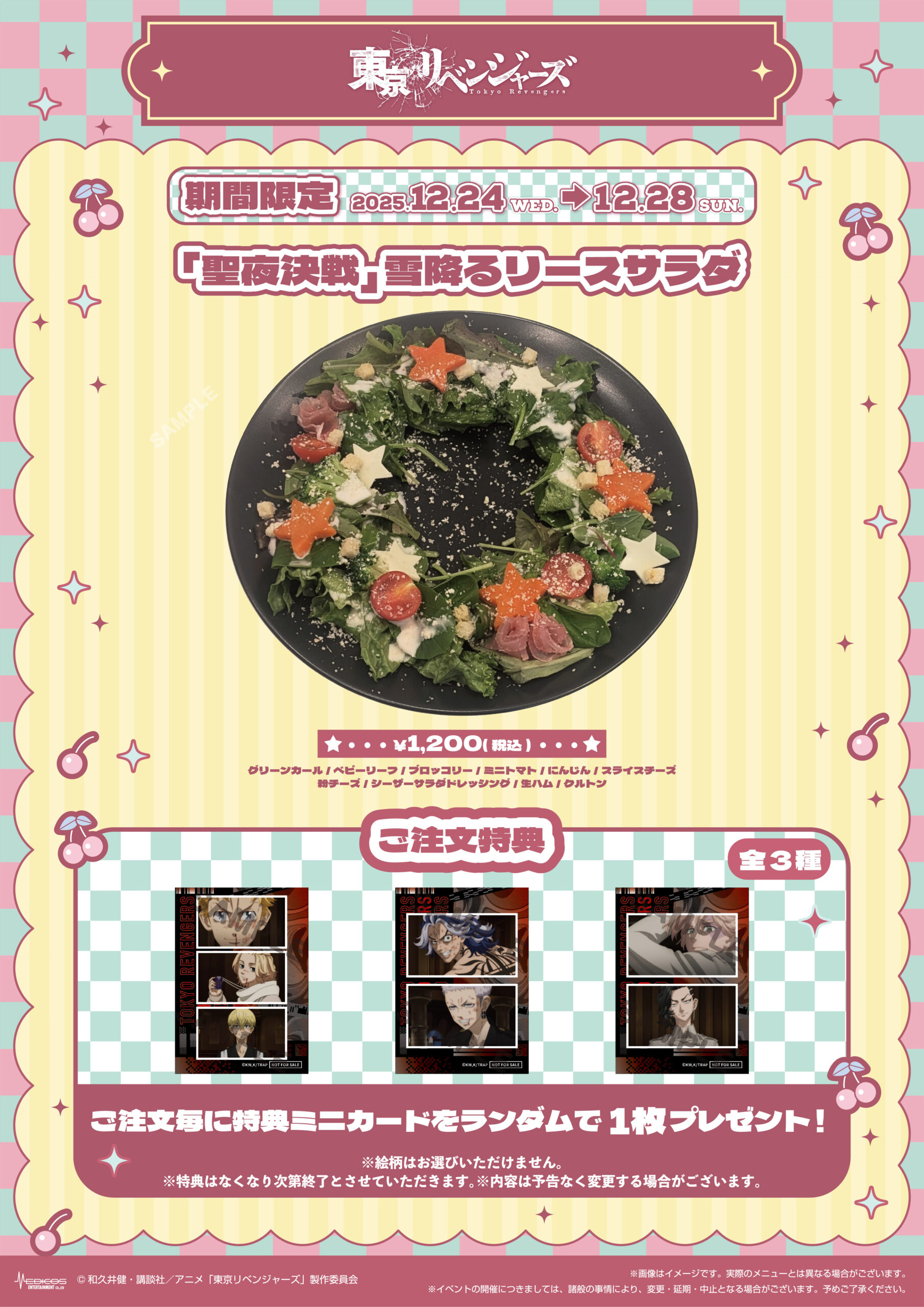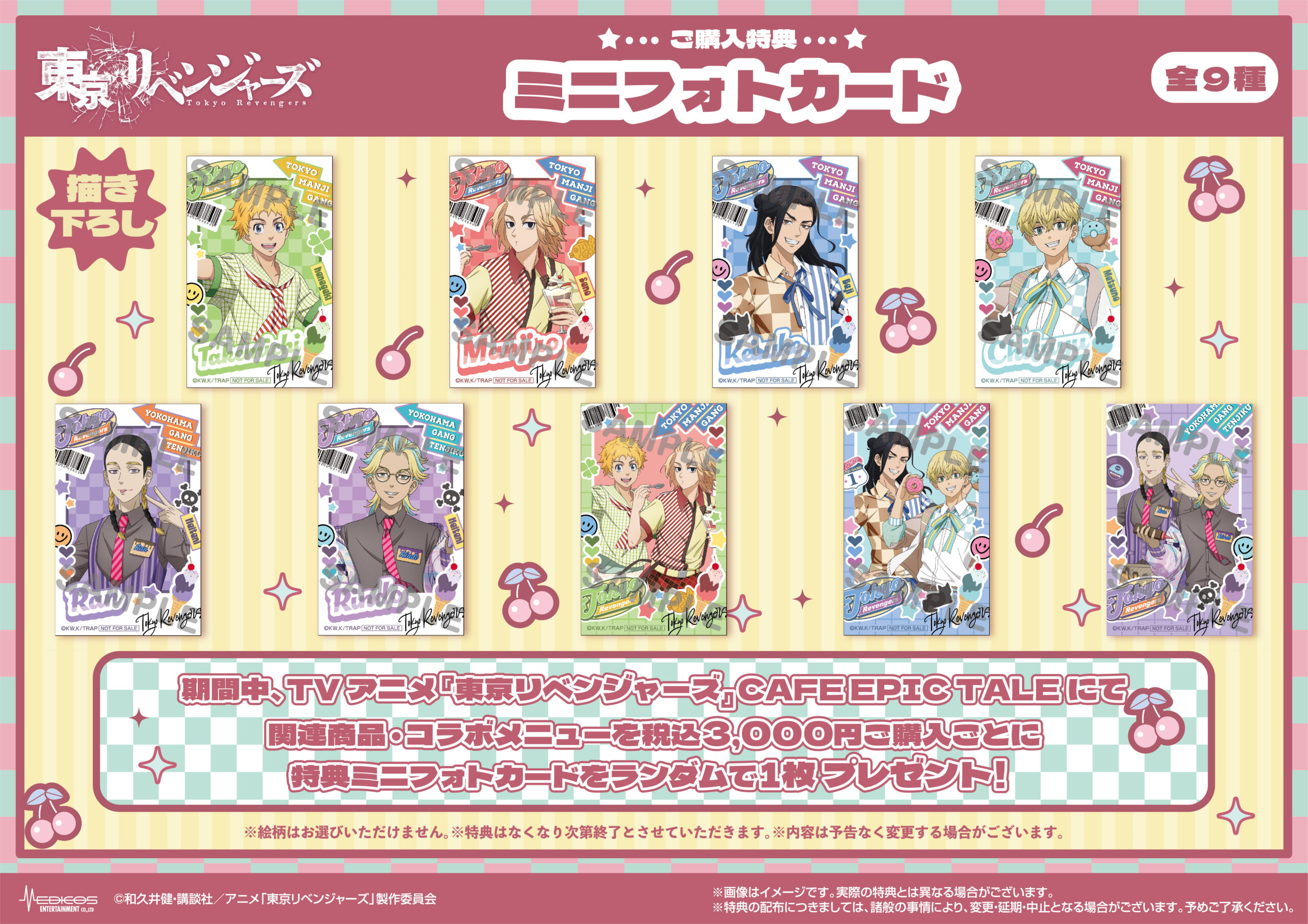 期間中、TVアニメ『東京リベンジャーズ』関連商品(コラボメニューを含む)を税込3,000円お買い上げごとに特典ミニフォトカード(全9種)をランダムで1枚プレゼント!