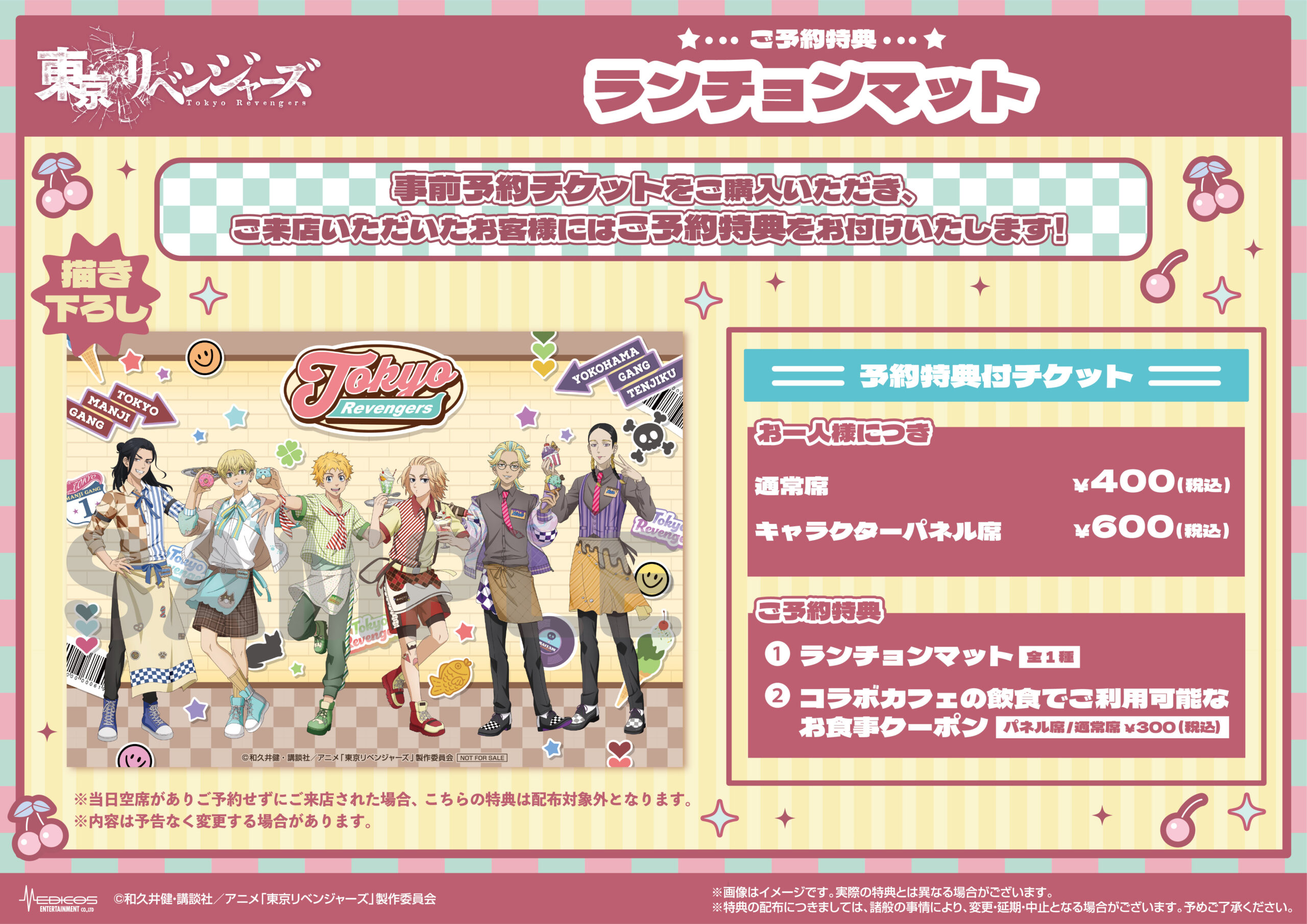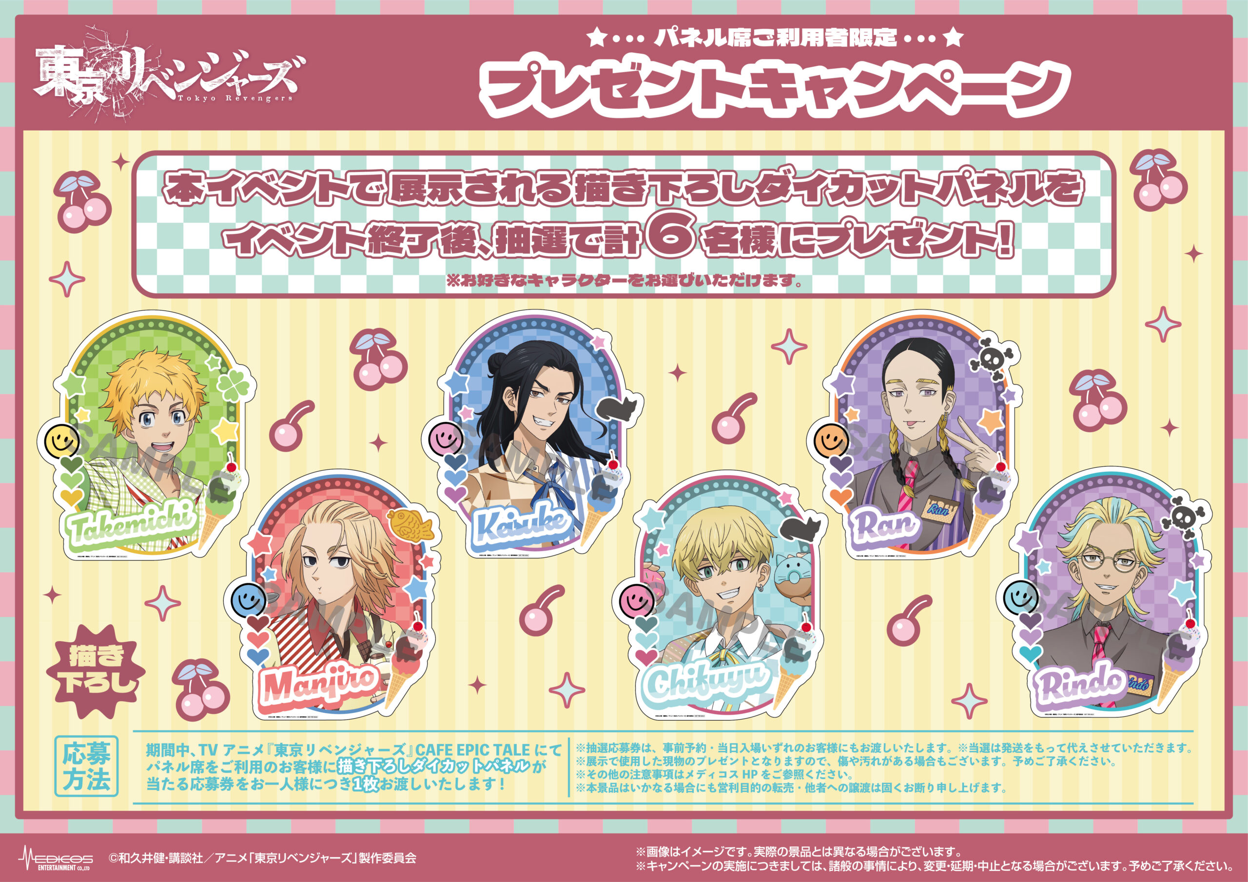期間中、TVアニメ『東京リベンジャーズ』CAFE EPIC TALEにてキャラクターパネル席をご利用のお客様に、お一人様1回のご利用につき応募券を1枚お渡しいたします。