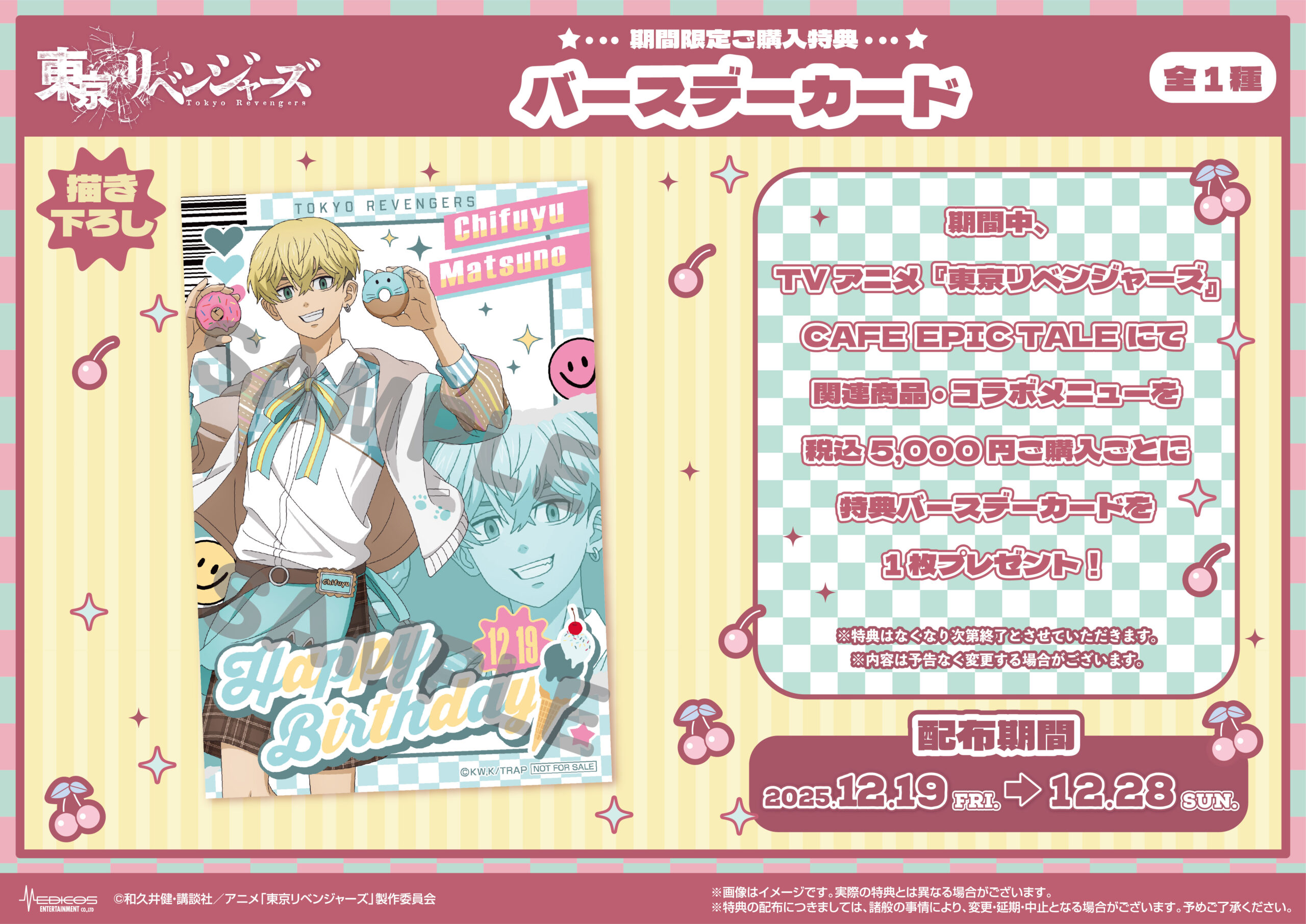 期間中、TVアニメ『東京リベンジャーズ』関連商品(コラボメニューを含む)を税込5,000円お買い上げごとに松野千冬のバースデーカード(全1種)を1枚プレゼント!