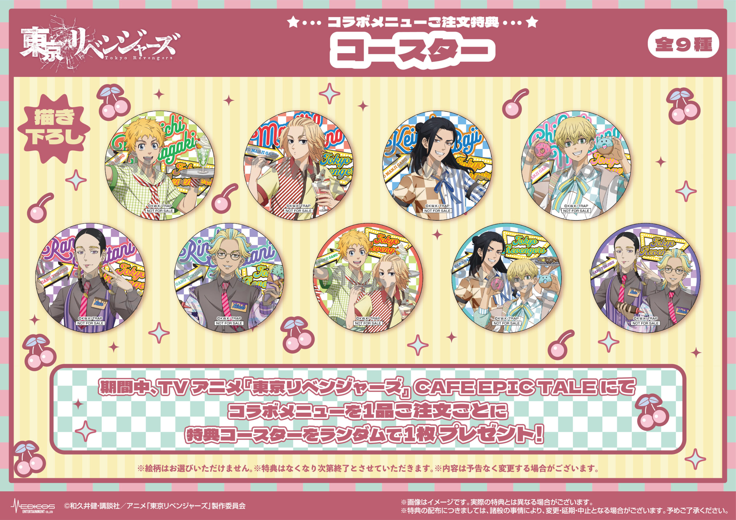 期間中、TVアニメ『東京リベンジャーズ』コラボメニューを1品ご注文ごとに特典コースター(全9種)をランダムで1枚プレゼント!