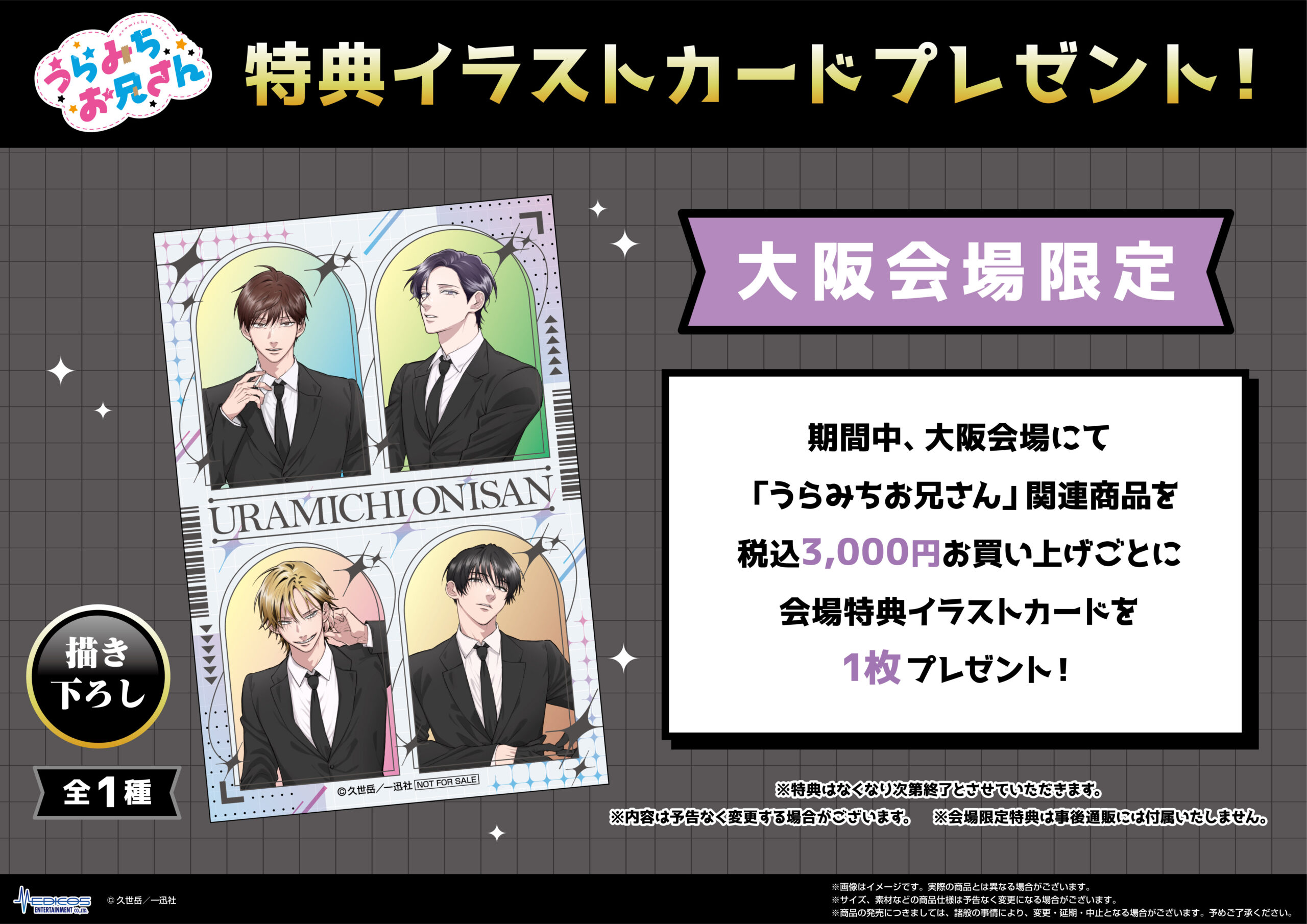 期間中、大阪会場にて「うらみちお兄さん」関連商品を3,000円(税込)お買い上げごとに大阪会場限定特典イラストカード(全1種)を1枚プレゼント!
