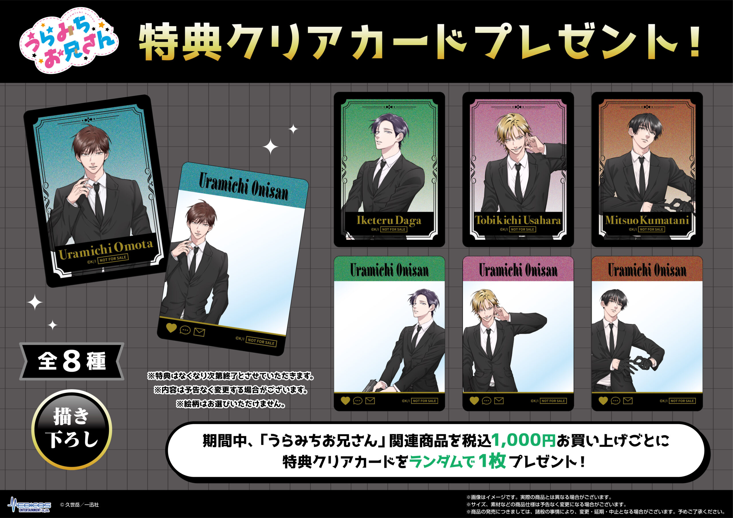 期間中、「うらみちお兄さん」関連商品を1,000円(税込)お買い上げごとに特典クリアカード(全8種)をランダムで1枚プレゼント!